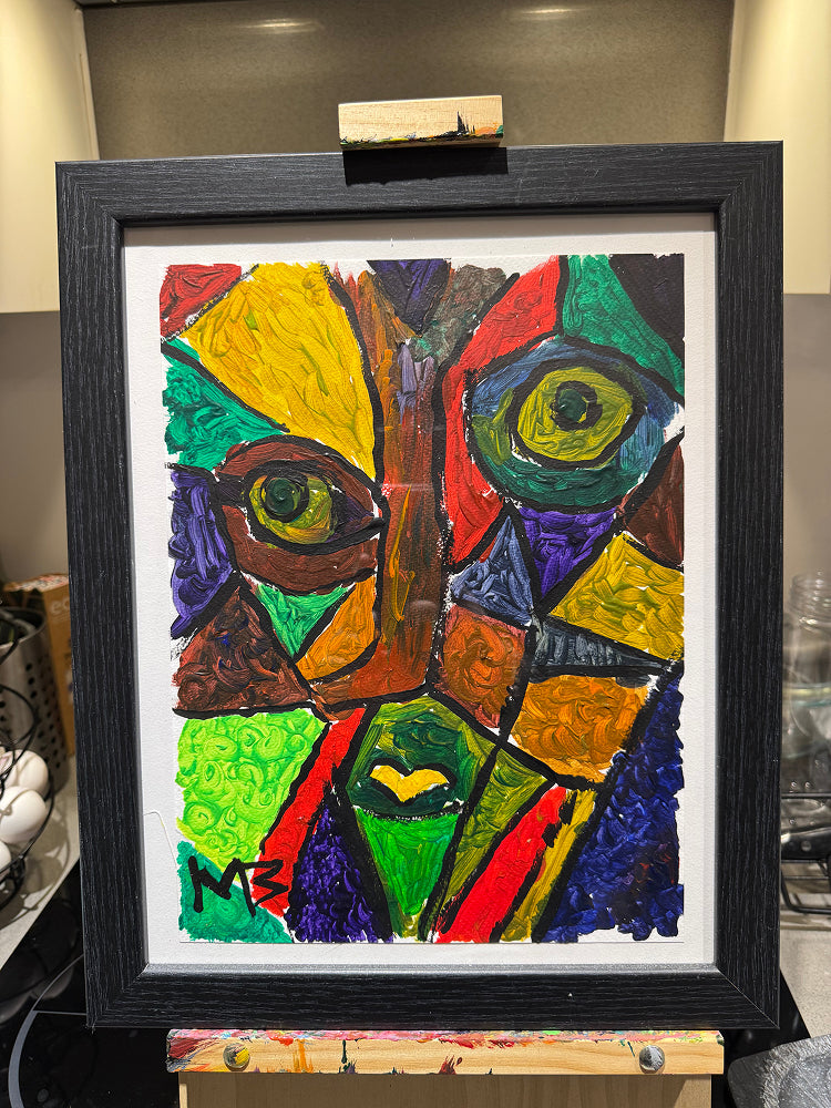 A powerful abstract face painting expressing inner vision, awareness, and emotional depth. Bold geometric forms and vibrant colors create a striking visual identity that symbolizes consciousness, perception, and human complexity—perfect for statement walls, modern interiors, and collectors seeking meaningful contemporary art.