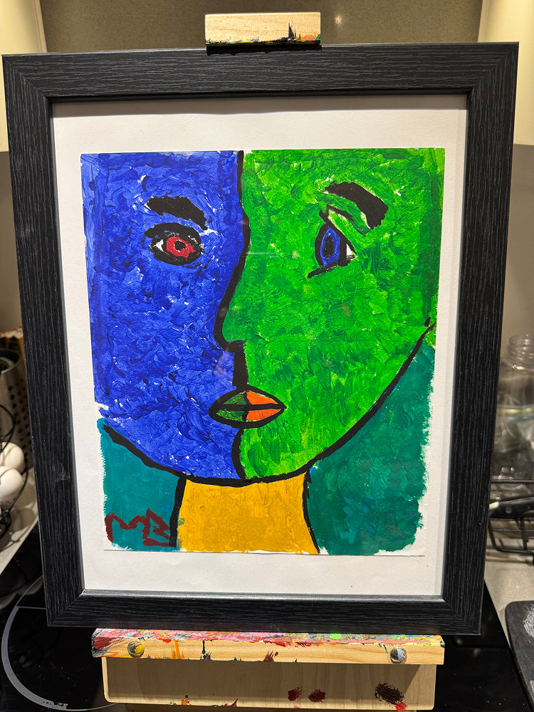 This striking split-palette portrait serves as a logical metaphor for the complexity of the human mind. By dividing the face into cool blue and vibrant green halves, the artist illustrates the constant balance between quiet reflection and active growth.
